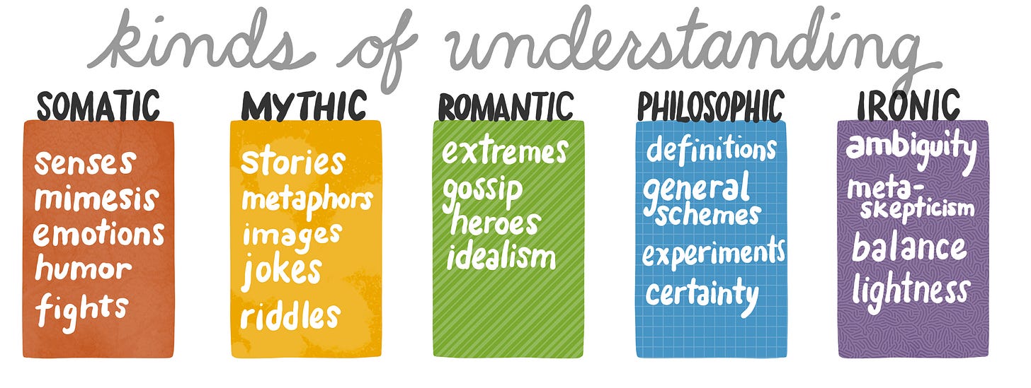That all aspects of the curriculum should engage something that could be called “spiritual” is definitely orthodox Eganism — though he vacillated between emphasizing and de-emphasizing it, depending on the audience. (I definitely de-emphasized it in my ACX review.) My favorite example of this comes in a question-and-answer section of The Educated Mind, when a fan suggests that she’s found a sixth kind of understanding: “spiritual”.1