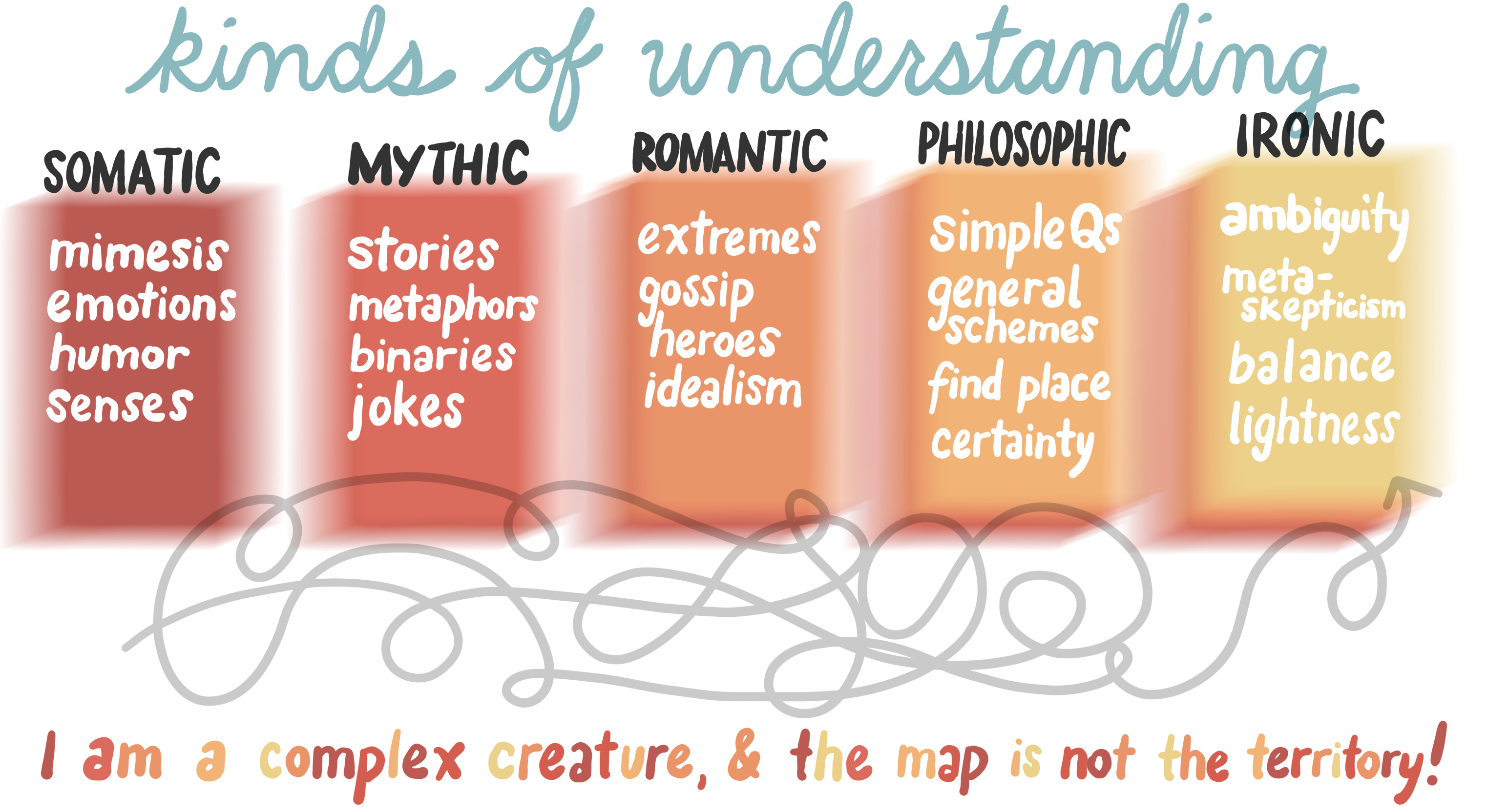 But it’s also not a race to see who can get the most Philosophic understanding first. The other kinds of understanding aren’t steps to be trod upon and then kicked away; a well-educated mind is one that keeps as much of Somatic, Mythic, and Romantic understanding alive as possible.