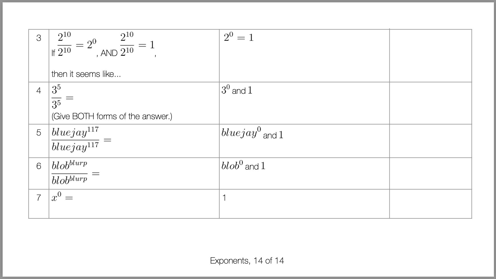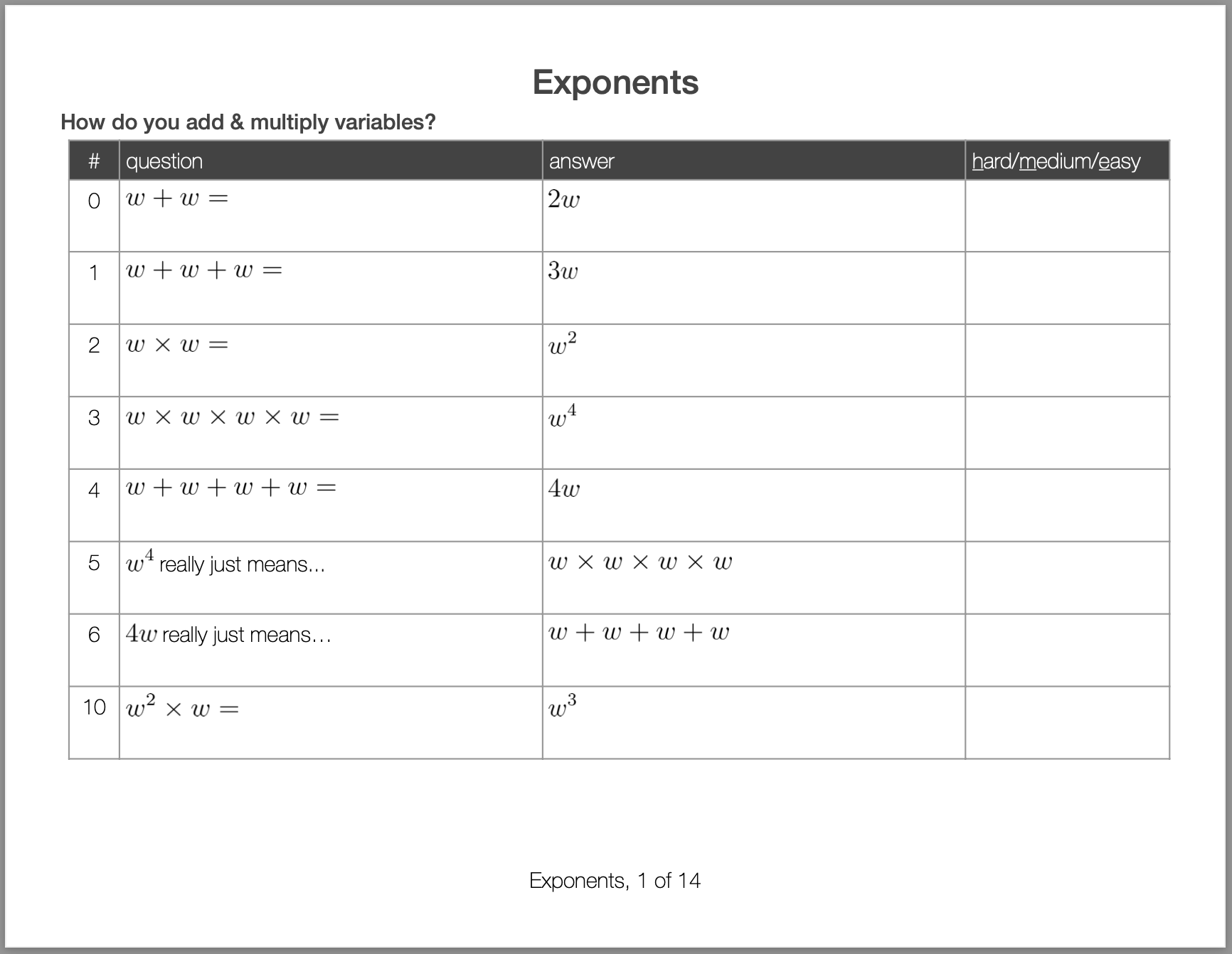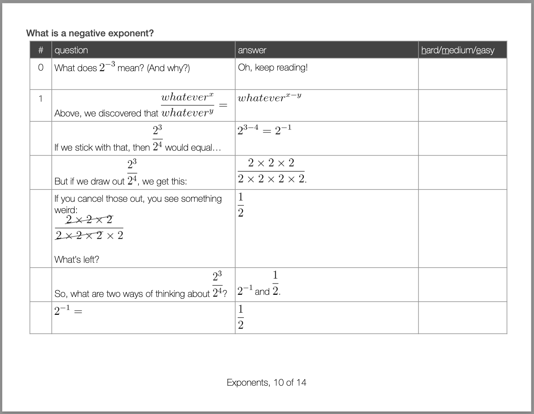 Each row gives a simple problem, so simple it can be done in a student’s head, with no need for pencil and paper. The problems on the first rows are below the student’s ability level — they’re what the student already knows.