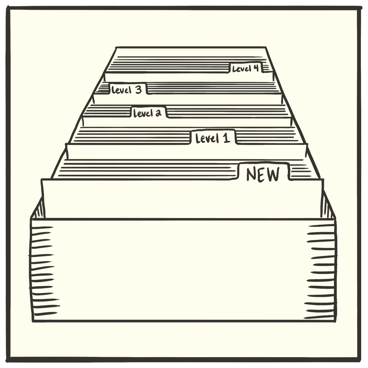 The traditional answer is to get a notecard box with divisons, and number the divisions “Level 1”, “Level 2”, and so on, all the way up to “Level 7”.