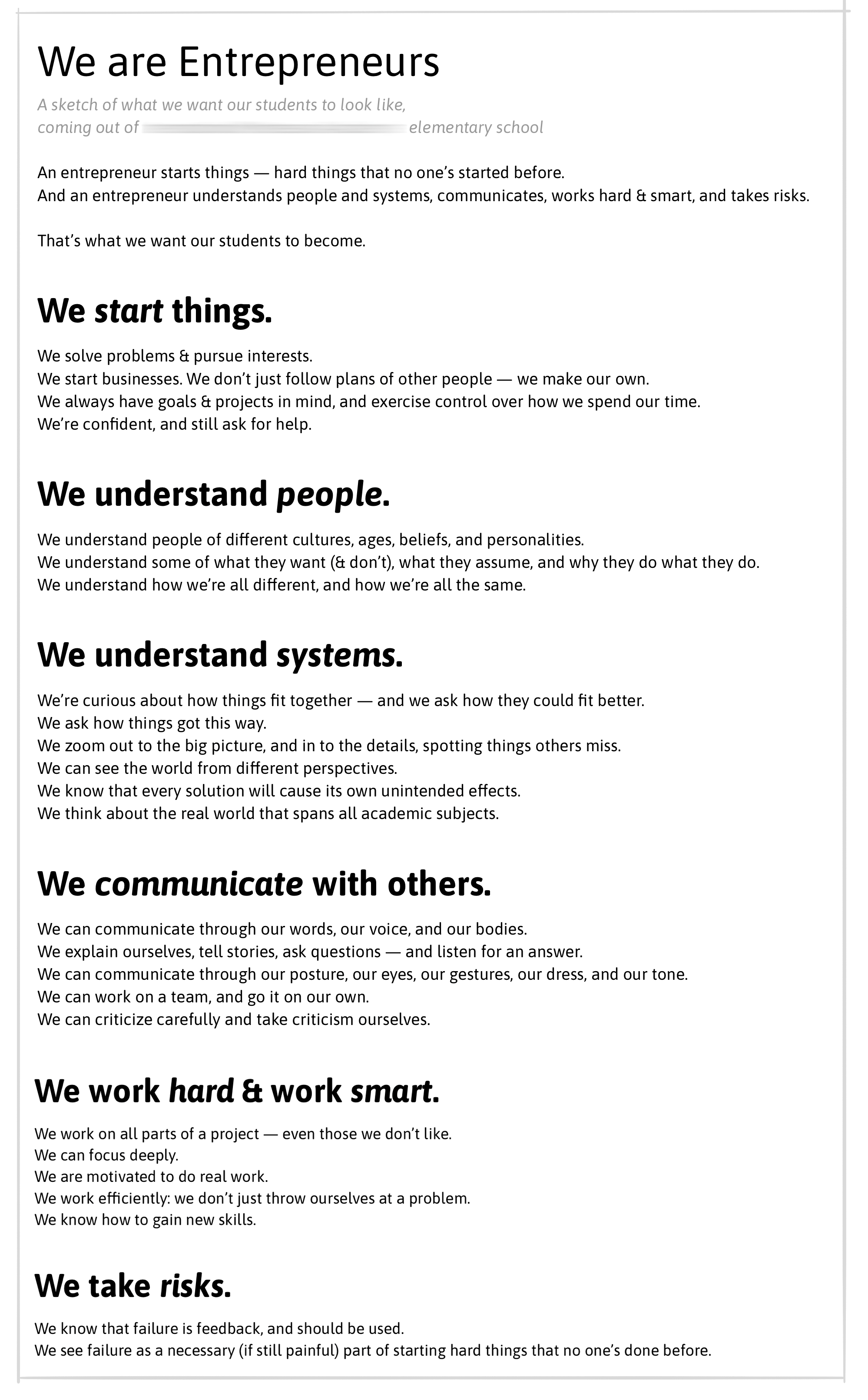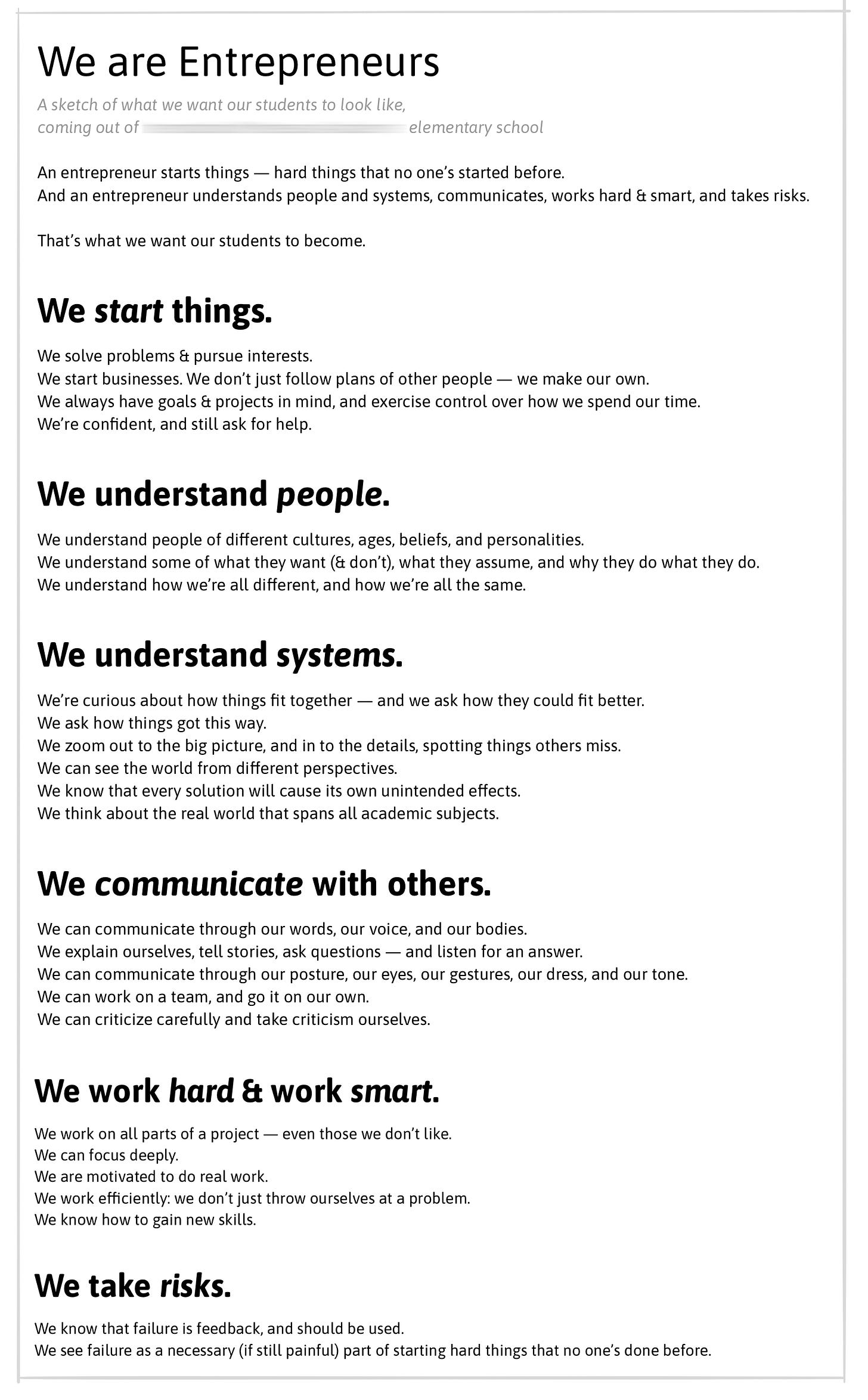 And when my wife and I helped run a start-up elementary school outside Seattle, we chose six. As the stated goal of the school was to promote entrepreneurship, we picked them to support that: