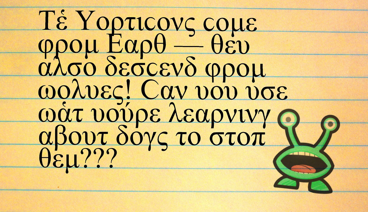 Weekly (or daily), a cryptic message appears on the wall written in a non-Latin script — say, Arabic, Cyrillic, Devanagari, Greek, Hangul (Korean), Hebrew, Katakana (Japanese), Pinyin, Tamil, Tengwar, Thai, or ancient Phoenician — and kids using all the tools they have to figure out what’s being written.