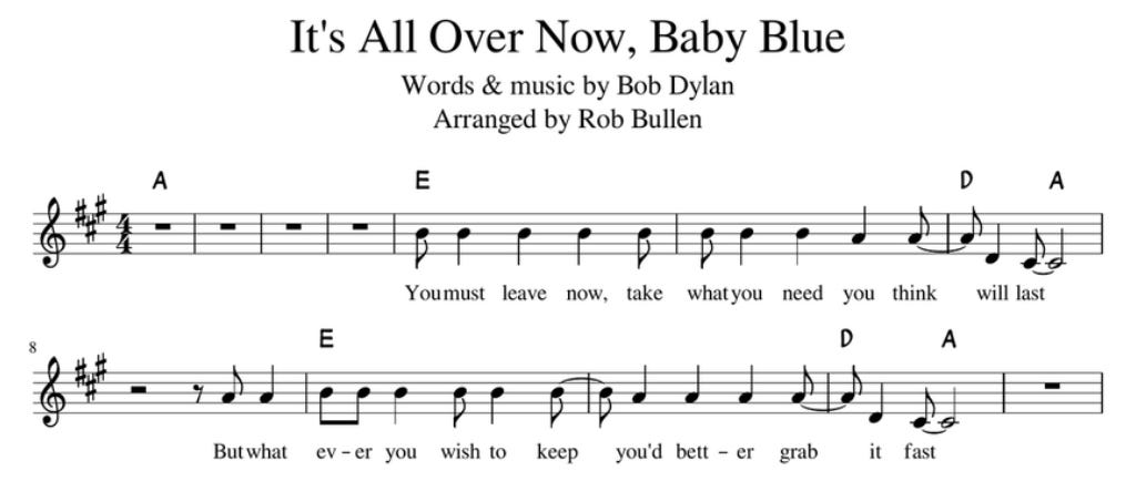 But for the moment, I’ll give a brief example in [rolls a die] music. Let’s take the song “It’s All Over, Baby Blue” by Bob Dylan, as he performed it at the 1965 Newport Folk Festival. Imagine we give this (along with ~99 other songs) to kids in elementary, middle, and high school: