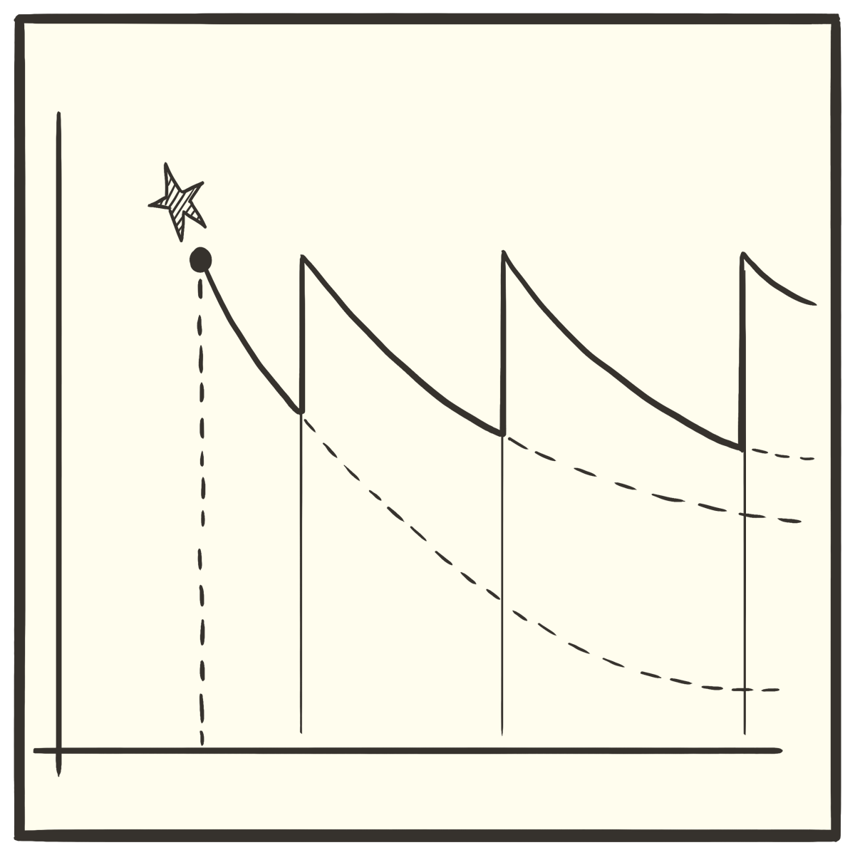 Purists will note that this doesn’t follow the precise equation of the forgetting curve. Ultra-purists, however, will note that there are many mathematical attempts to capture forgetting, and that they all disagree a bit. The “just double, idiot” method above gets close enough for our purposes.