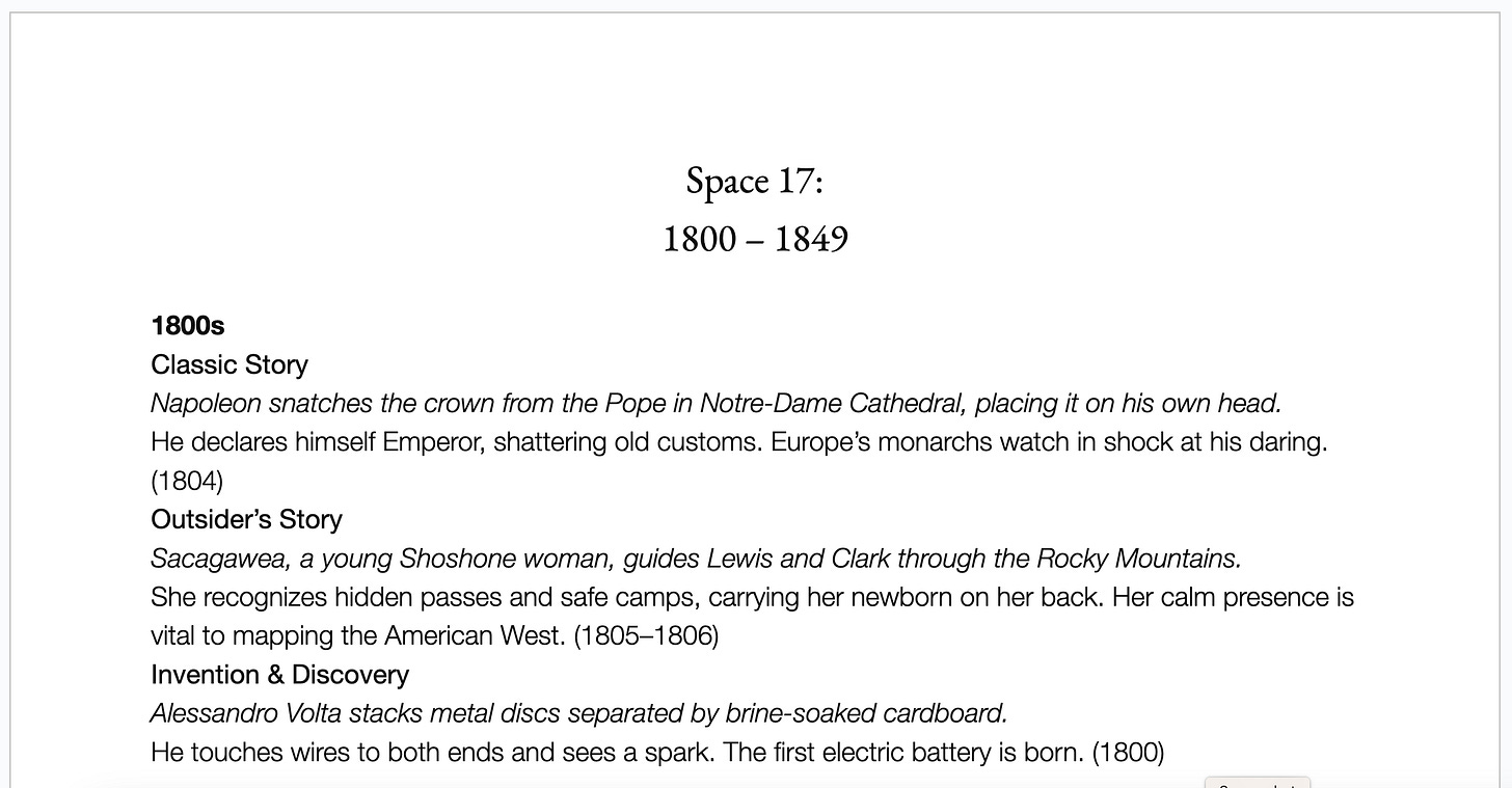 Help me build a “history memory palace” as described at https://www.losttools.org/p/history-in-elementary-school. Right now, give me three options for each of the “spots” in space 6. Make sure the events really happened in the times listed. Skew towards events that have visceral stories of individual humans at the center, the emotional binary of which can be easily grasped by a first-grader.This’ll give you three options for each; you can ask for more. Then just repeat, repeat, repeat for the other spaces.